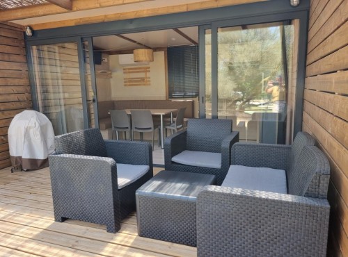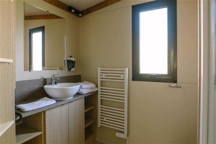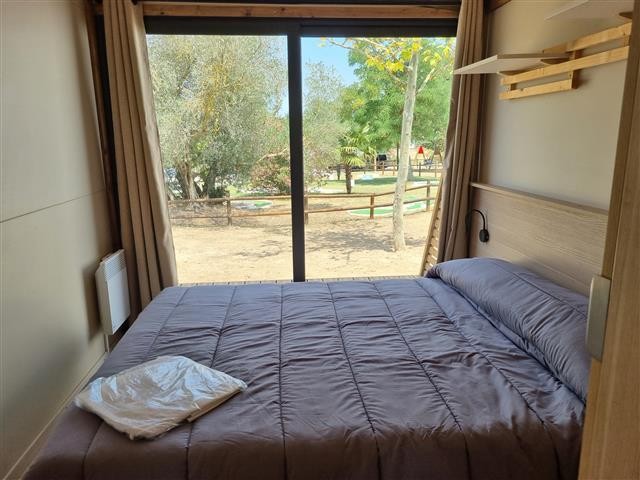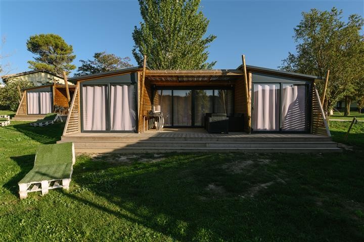 Bungalows para 5 personas con dos habitaciones con baño individual en cada una, salón con cocina totalmente equipada, , y , porche con mesas de jardín. Equipadas con televisión , calefacción, lavavajillas, cafetera, secador de pelo Mantas , sabanas y menaje de cocina. Situados en la zona glamping. frente al río.