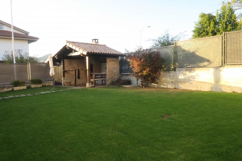 La cocina tiene isla central y mucha luz exterior, conectando con el jardín por ventanales grandes en donde se ubica el porche y una estupenda barbacoa cubierta.