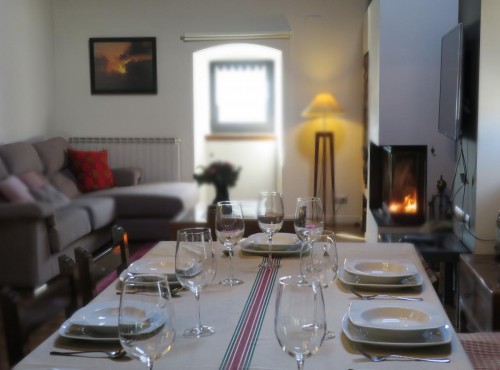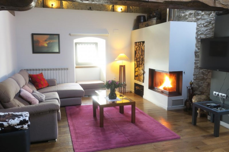 El salón es muy acogedor con una altura de techo de 4 metros a vista. Frente a los sofás se encuentra la chimenea, la TV, una mesa comedor...
