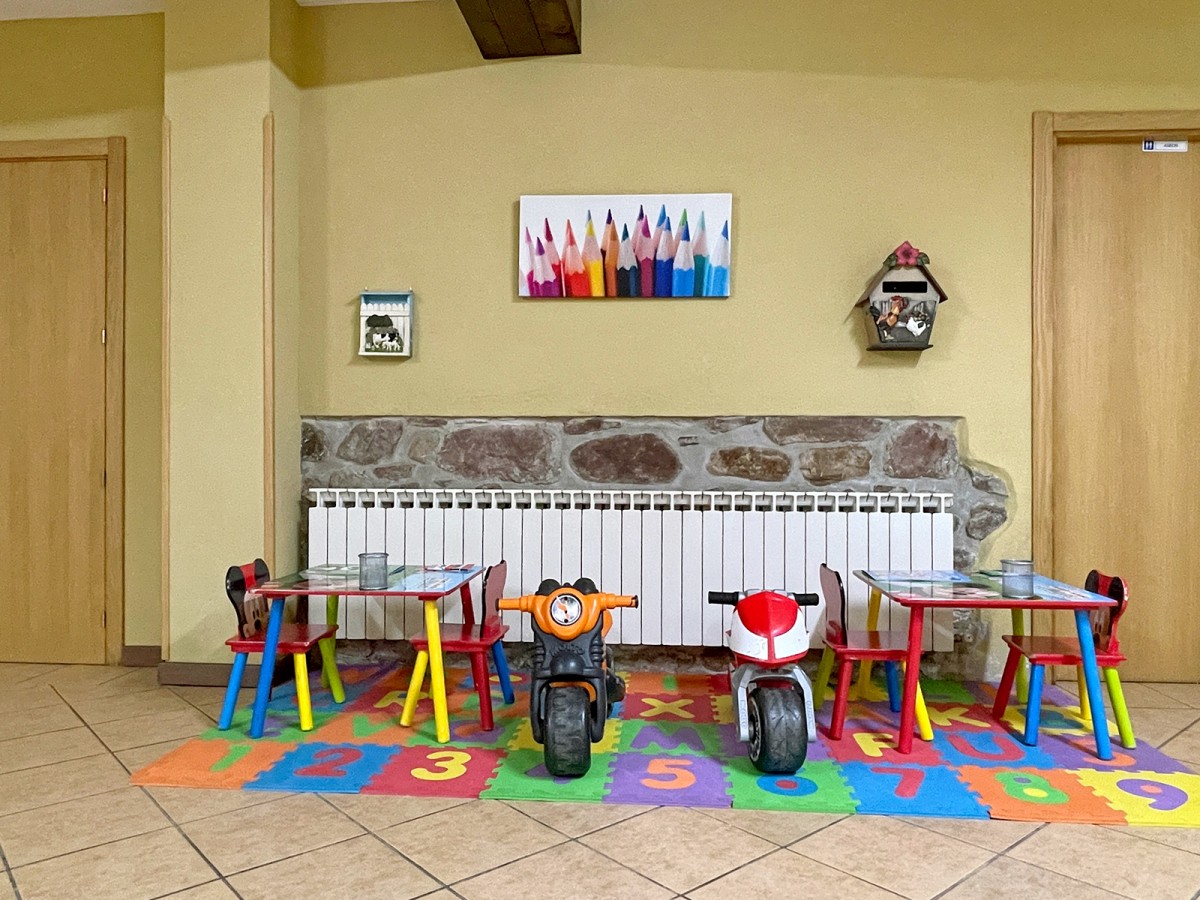 * Sala de juegos con billar, futbolín, ping-pong y zona específica de recreo para los más pequeños de la familia con mesas y sillas infantiles.