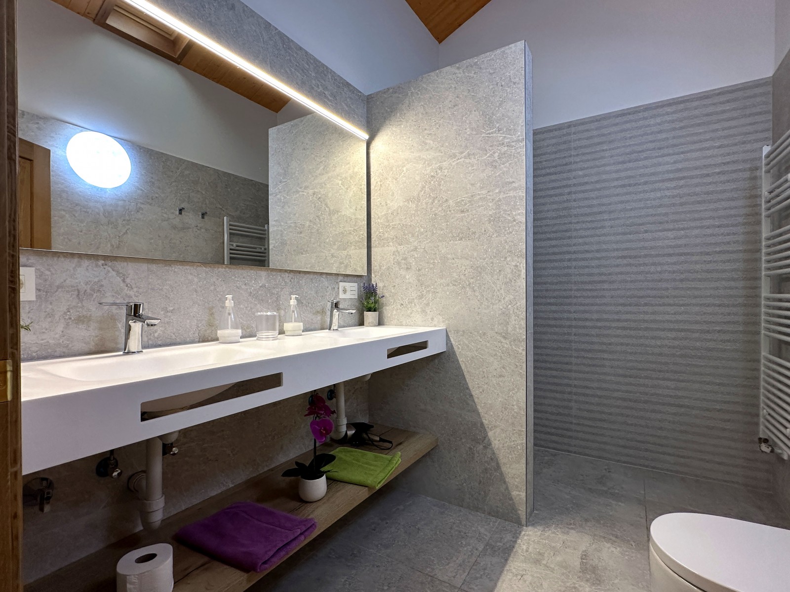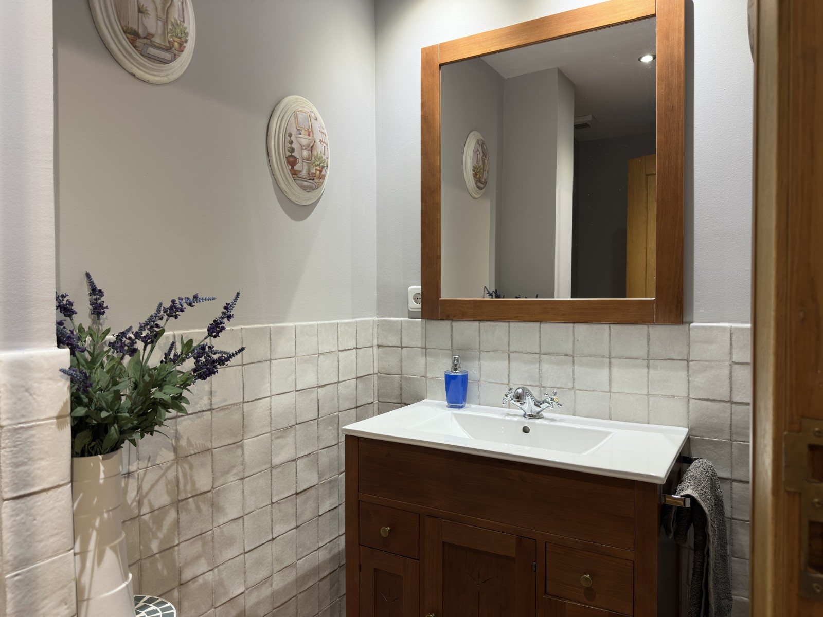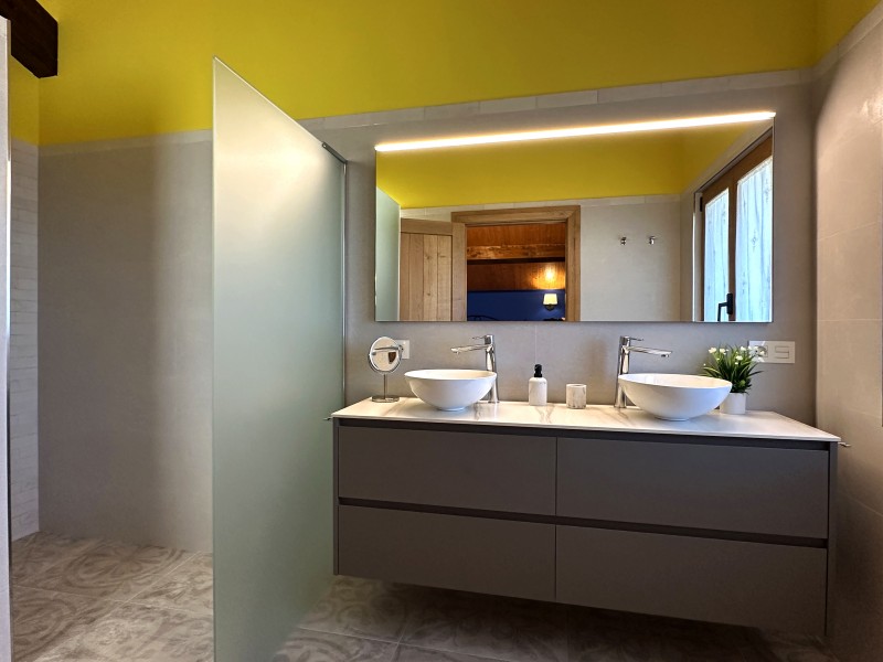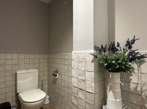 El suite tiene una amplia cama de 150cm y un baño completo (bañera y secador de pelo). La amplitud de está habitación permite disponer un sofá que puede utilizarse como cama si se desea. La casa también proporciona cuna y bañera para bebes.