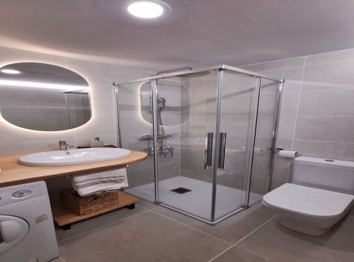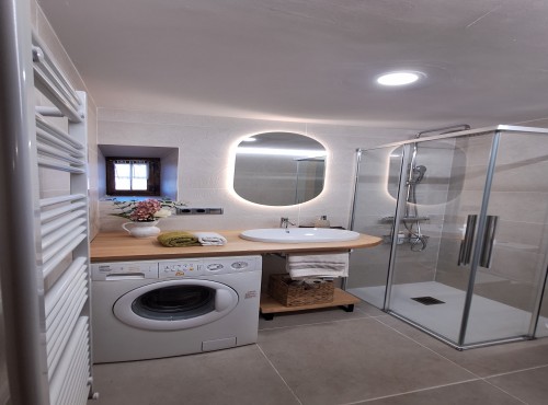 Sus 240m2 están distribuidos en dos plantas. En la planta baja se encuentra la cocina, amplia y totalmente equipada con todo tipo de electrodomésticos como por ejemplo lavavajillas, microondas etc. Uno de los baños, con una amplia bañera. El salón, punto de referencia de la casa, ya que su fogón hace de esta parte de la casa un lugar apacible y acogedor.