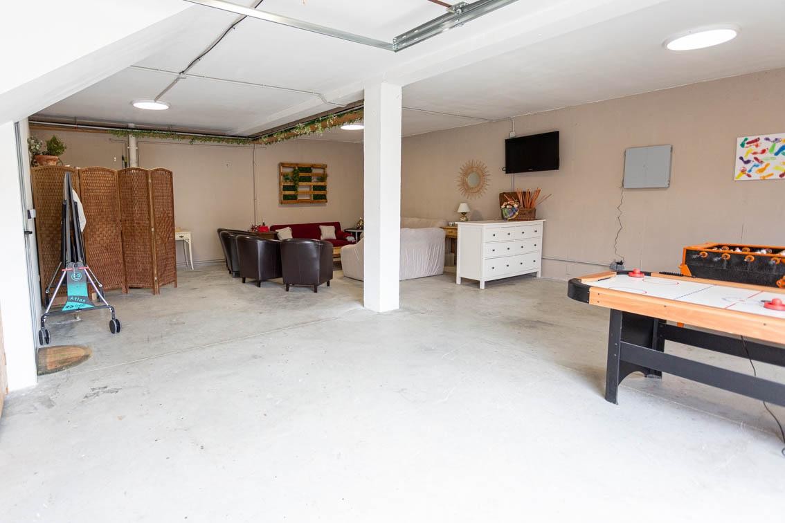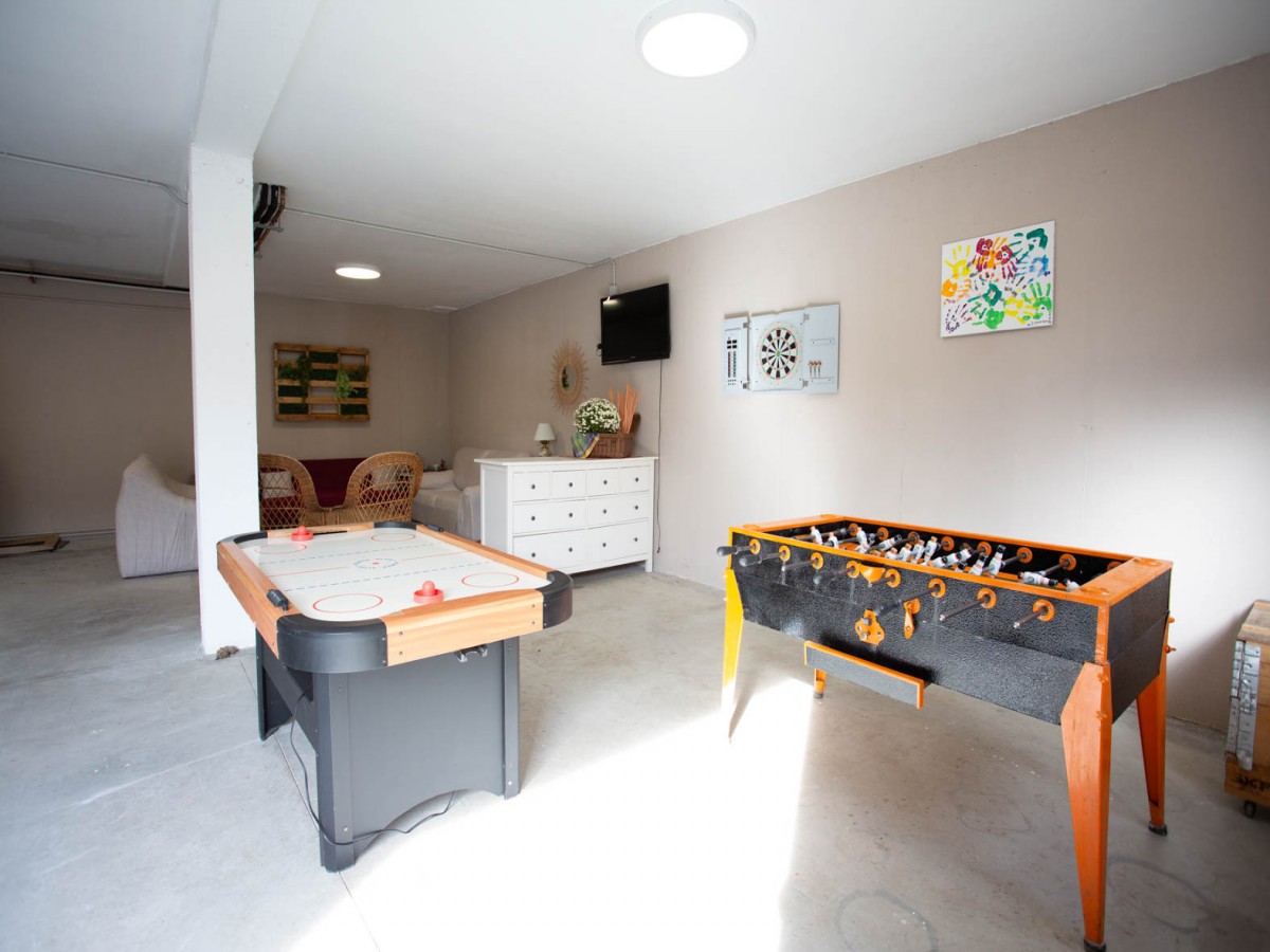 En la planta baja está la sala de juegos con salida al jardín y una barbacoa. futbolín, diana, pingpong